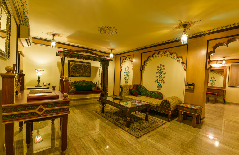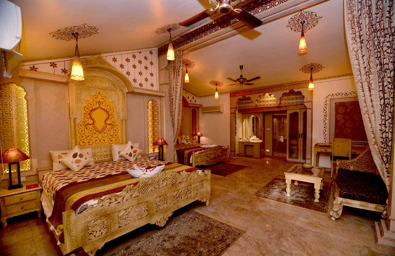 | Luxury Accommodation A distinguished address & situated in the heart of this gentle and affable city which overlooks the lush expanse of the Jodhpur Golf Course. The hotel houses 240 well-appointed rooms with traditional and picturesque dwellings set in a lush green landscape. Perfect amalgamation of regal ambience, world class luxury & warmth of Indian hospitality. With your stay you receive 100% unique Rajasthani extravaganza coupled with the warmth of our service. The hotel accommodation at the Khwabeeda Palace has ethnic rooms and suites to meet your every desire of a great stay.